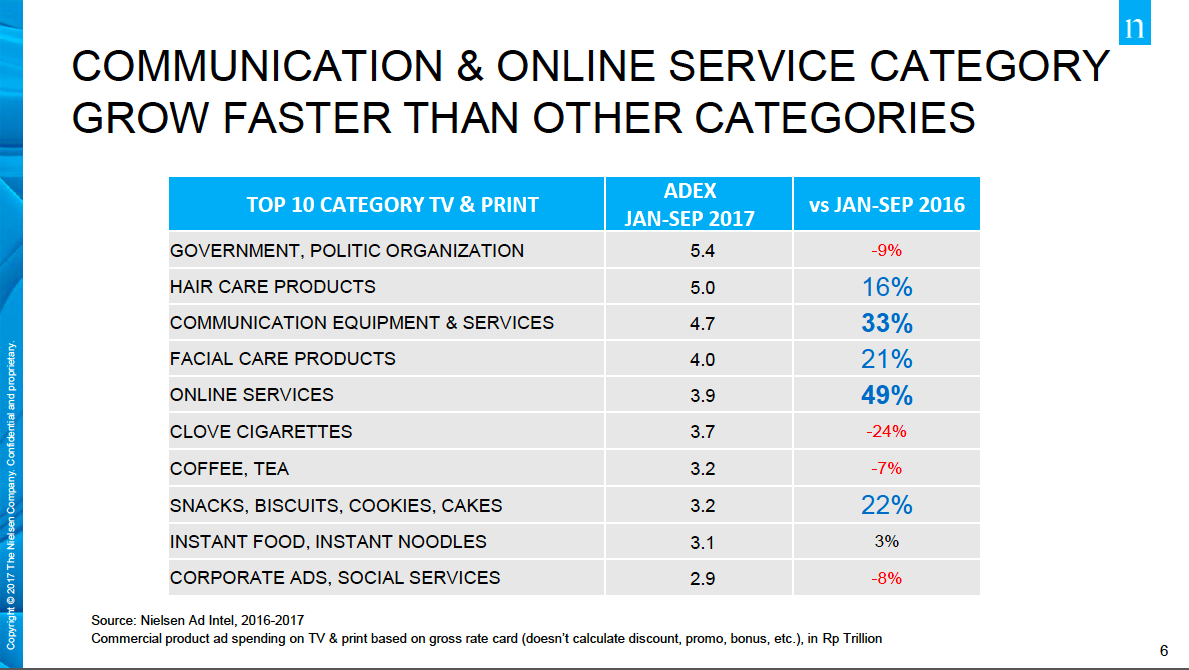 Sementara dilihat berdasarkan kategori produk, Pemerintahan dan Organisasi Politik masih menjadi pengiklan terbesar dengan nilai belanja iklan Rp5,4 Triliun, disusul oleh Produk Perawatan Rambut dengan total belanja iklan Rp5 Triliun dan pertumbuhan sebesar 16%. Pengiklan terbesar ketiga adalah Peralatan dan Jasa Telekomunikasi dengan total belanja iklan sebesar Rp4,7 Triliun dan mengalami pertumbuhan 33% dibandingkan dengan Januari-September tahun 2016. Kategori Layanan Online berada di peringkat ke lima setelah Produk Perawatan Wajah dengan nilai belanja iklan mencapai Rp3,9 Trilyun dan pertumbuhan belanja iklan paling besar yaitu tumbuh hingga 49% dibandingkan tahun 2016.
