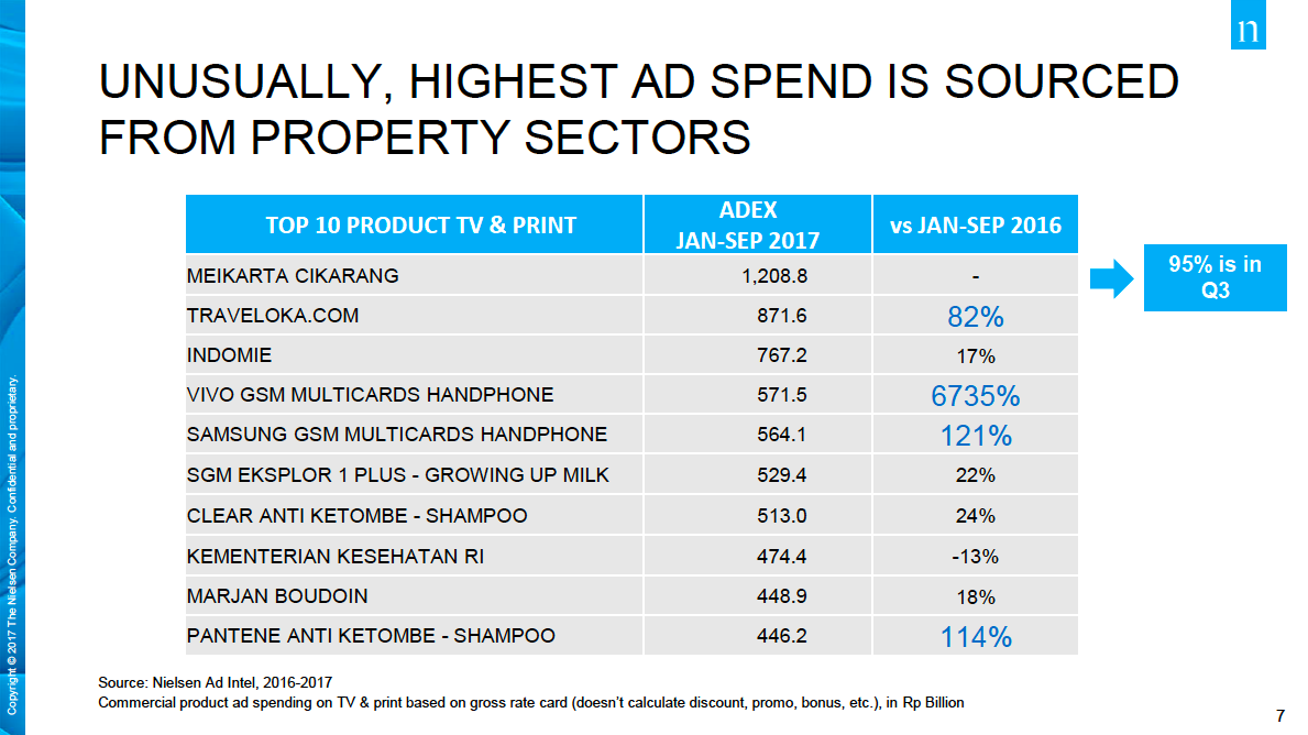 Sementara itu merek-merek dengan belanja iklan tertinggi di sepanjang Januari-September 2017 adalah pendatang baru Meikarta dengan nilai belanja iklan mencapai Rp1,2 Trilyun, disusul oleh Traveloka dengan total belanja iklan sebesar Rp871,6 Miliar yang tumbuh sebesar 82% dibandingkan tahun sebelumnya. Di peringkat ke tiga pengiklan terbesar adalah Indomie dengan total belanja iklan sebesar Rp767,2 Miliar. Dari kategori Peralatan Telekomunikasi, Vivo Smartphone masuk dalam daftar pengiklan terbesar di urutan ke empat dengan total belanja iklan mencapai Rp571,5 Miyar dan tumbuh hingga 60 kali lipat. Samsung Smartphone meningkatkan belanja iklannya sebesar 121% dan berada di urutan ke lima dengan nilai Rp564,1 Milyar.
