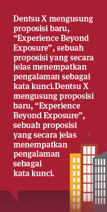 Berbekal pengalaman sukses yang sangat panjang dalam memberikan solusi terintegrasi satu pintu khususnya di Negara-negara Timur, dentsu X akan terus menggabungkan kemampuan strategis dan kreatif berkualitas tinggi dikombinasikan dengan budaya yang kuat serta perilaku keilmuan dari para ahlinya. Semua hal ini akan membantu brand bergabung dengan masyarakat luas dalam mengidentifikasi nilai-nilai esensial serta ragam motivasi melalui pemanfaatan data.